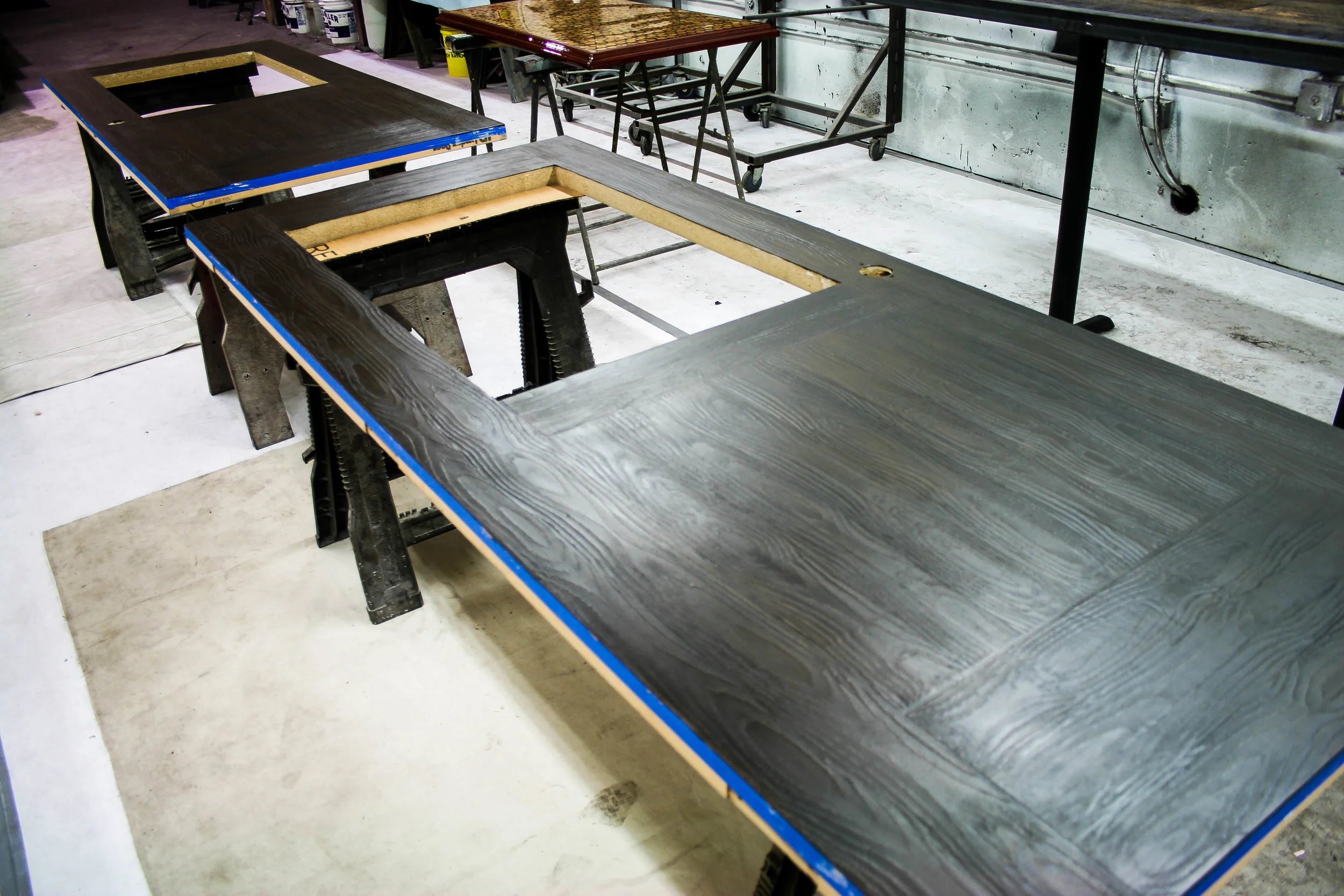 We also design bathroom doors with a faux finish to give a wood texture after painted and hand made door handles are added.